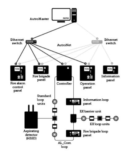 A maximum of 64 system units (panels, controllers) can be connected to the AutroNet. The system has a great capacity, and the fact that all types of loop units can be connected to the same detection loop gives large flexibility. Uploading of configuration data or system software to the entire system can be done from one single point. The USB port is used for downloading data from a USB memory stick.